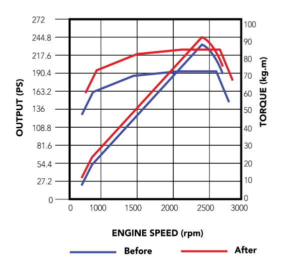 • Tenaga maksimum ~ 285 PS @ 2.400 rpm, torsi ~ 80,5 kg·m @ 1.450-2.400 rpm